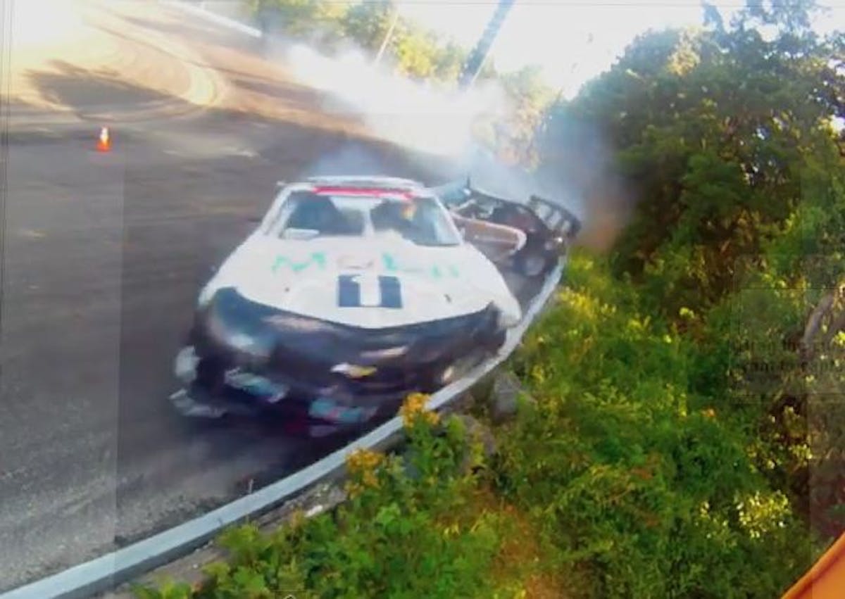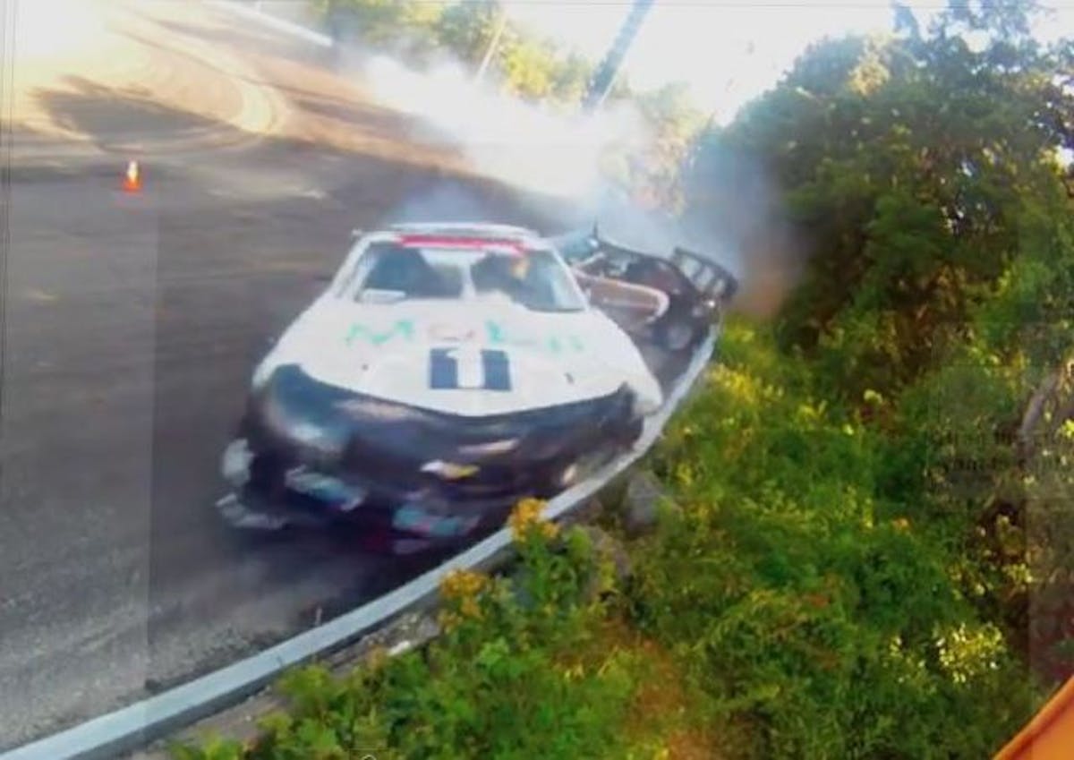Unfortunately for Tyler McQuarrie, his battle against a BMW M3 went all the way wrong when, as lead car, he bumped a tire wall with his back end. His competitor in the BMW followed him into the wall, and the two drift cars ended up in a rather nasty collision. The drivers were OK, though we’re sure those cars needed a good bit of work to get back on the track. And of course, the crowd goes wild. Check out another angle of the accident down below.