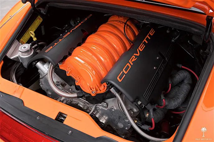 In fact, this example is most known as one of the last ‘air cooled’ Porsches. This particular 911 is no longer powered by its original air cooled 3.6 liter flat-six engine. The car has become host to a freshly rebuilt 5.7 liter LS1 V8 from a C5 Corvette, boasting a respectable 475 horsepower thanks to a few new modifications. The engine sports a few breathing upgrades from FAST like their 102mm intake manifold and throttle-body combination, while exhaust needs are handled by a set of custom-fabricated 180 degree exhaust manifolds which exit to a centered exhaust in the rear.