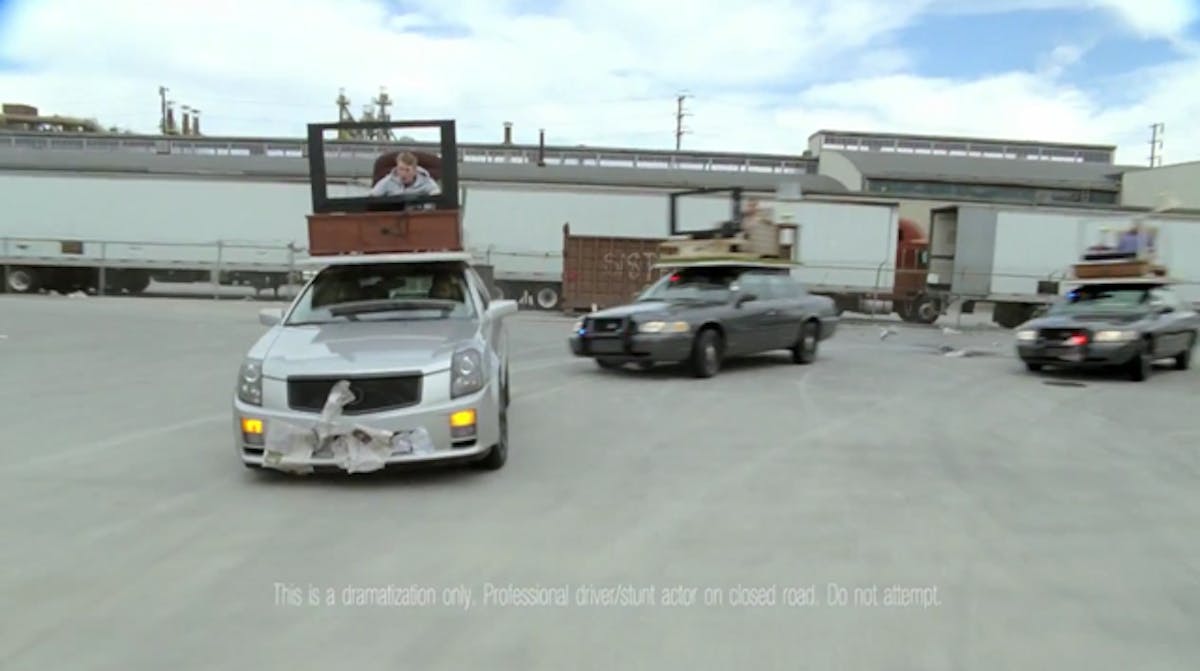 Of course the disclaimer across the bottom of the screen advises viewers, “This is a dramatization only. Professional driver/stunt actor on closed road. Do not attempt.” Sure, you should not attempt attach a recliner to a CTS-V and attempt to ditch the cops in real life, but it makes for a great commercial. It also proves that the CTS-V plenty capable of out performing the Crown Victoria Police Interceptors, not that we are advising anyone to attempt to test this hypothesis…