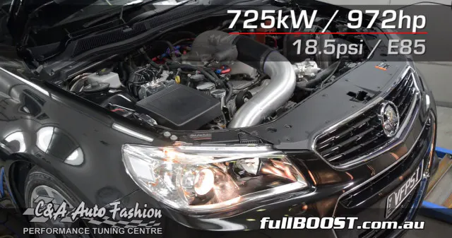 The first dyno run shows that the car is making 915 horsepower at 18.5 PSI – throughout the runs you’ll notice that the boost level stays the same and the horsepower number keeps climbing. Oh, the beauty of engine management. On the last run, Con’s Commodore puts down an impressive 972 HP, which equates to a crank horsepower number right around 1,100. Not bad for a daily driver, eh?