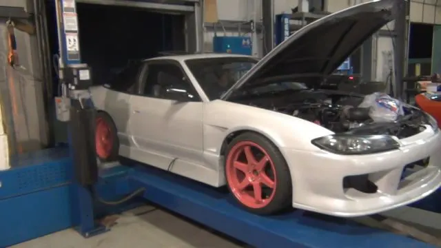 Taking one look at this 240 and you would expect it to sound similar to a weed-whacker when it revs up, but the throaty roar this thing produces on the dyno is identical to that of some good ole modified late-model American muscle. The video caption says that this 240SX now gets its go from an LS1 with ported heads, an LS6 intake manifold, and a decent sized cam. As you can see from the under-car shots in the video, that nasty growl you hear is thanks to a set of long-tube headers and a custom dual exhaust that snakes its way to the original muffler cutout in the rear bumper. The car also has plenty of power to back up all that noise, laying down 422 horsepower and 375 pound feet of torque to the rear tires.