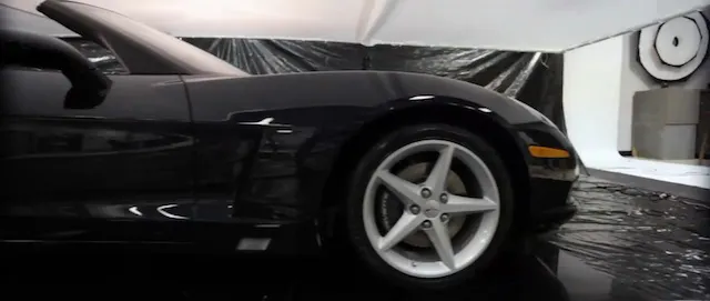 Black plastic tarp material is used to protect the platform that the Vette is driving on, and most of the time used during a photo shoot is actually spent during setup.