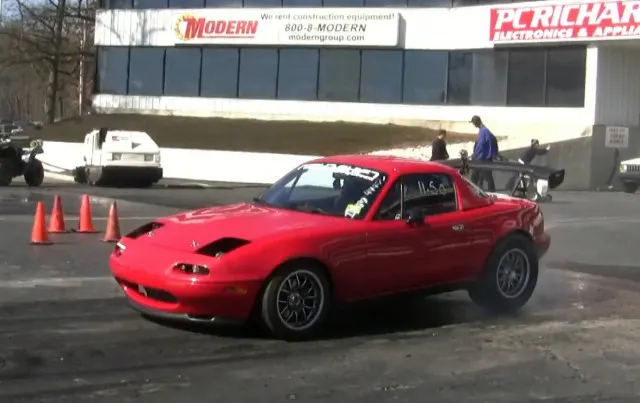This video we found on YouTube features one pissed-off little red Miata that will challenge every misconception you might have about these tiny cars, thanks to a mean rake courtesy of some fat Mickey Thompsons, and an LS1 rumble bellowing under the hood. We don’t get any details on the cars drivetrain combo, but what we do know is that it sounds pretty healthy, and can send this adult-sized go-cart to some very respectable ET’s.