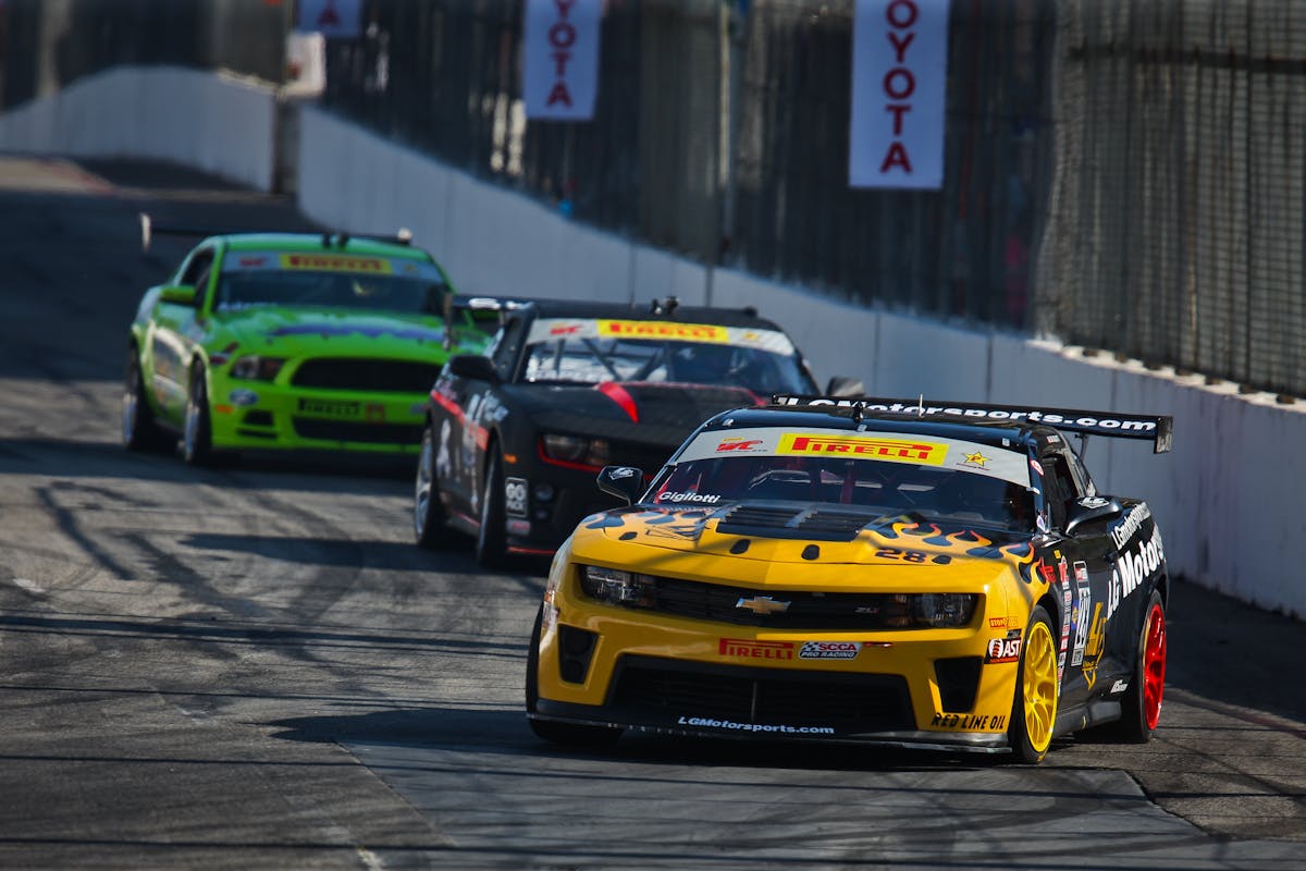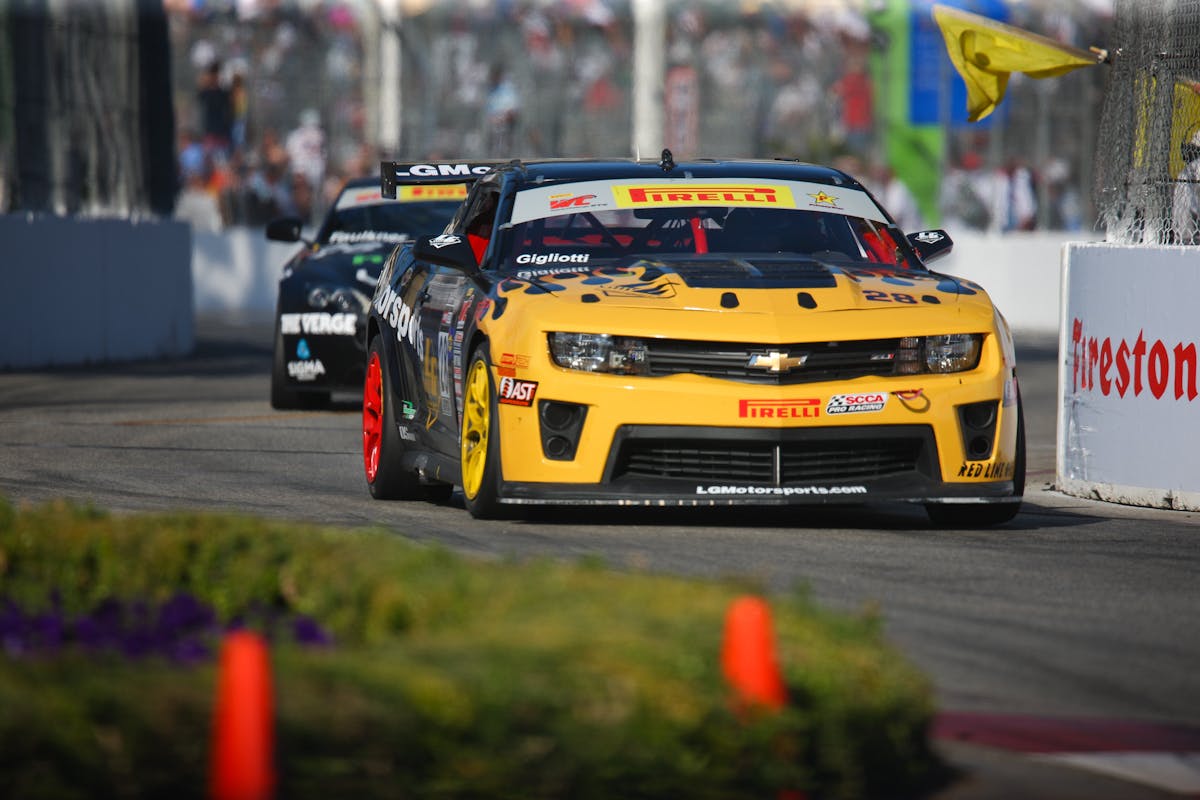 Running in the GTS class, which includes cars like the Porsche Cayman S, Acura TSX, Aston Martin Vantage GT4, and the Ford Mustang Boss 302S, Gigliotti piloted his Camaro to the 23rd starting spot in the mixed group of GT and GTS cars at Long Beach. Once the green flag drops, we see Gigliotti get a big holeshot and drive right around the two rows in front of him before the first turn. From there on, it’s bumper-to-bumper combat, with Brandon Davis’ Aston Martin getting a little love tap about 30 second in.