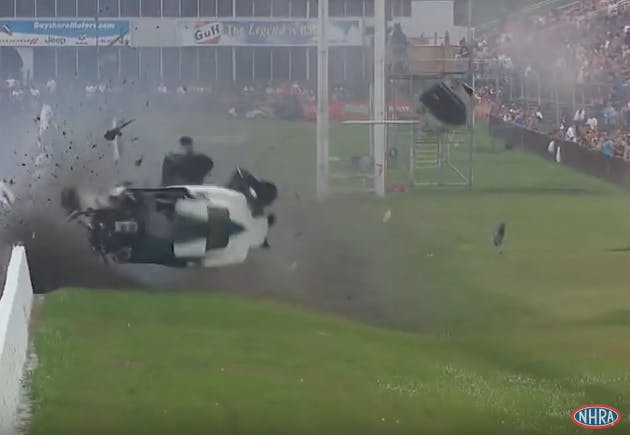 Check out this spectacular crash that luckily, he survived with only a broken arm and a bruised hip. The run looked wonky right out of the gates with both Corvette based cars swerving nervously in their lanes.