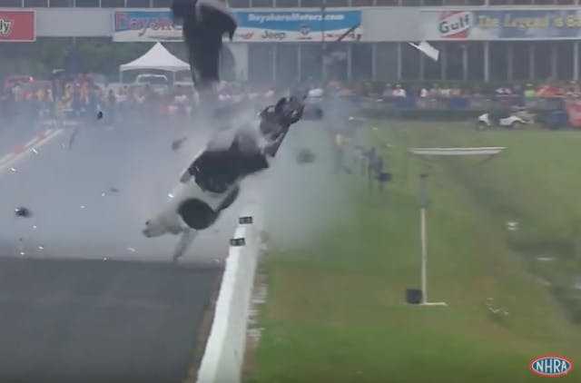 That Frigo escaped relatively unscathed is quite a testament to the car’s roll cage and structural design, not to mention NHRA safety standards and response crews. Looks like there will some late nights ahead sorting through what’s left of the car.