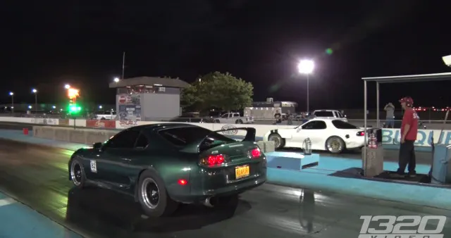 During the race against the Chevy II, before racing the Supra, we noticed some sparks that flew out from under the car. If you look closely, there looks to be a piece of metal bouncing down the track behind the car. We’re thinking that was the first bolt that popped out of the torque arm, weakening it for the next run. Hopefully the owner gets it fixed soon so he can have more fun in his monster of an RX-7.