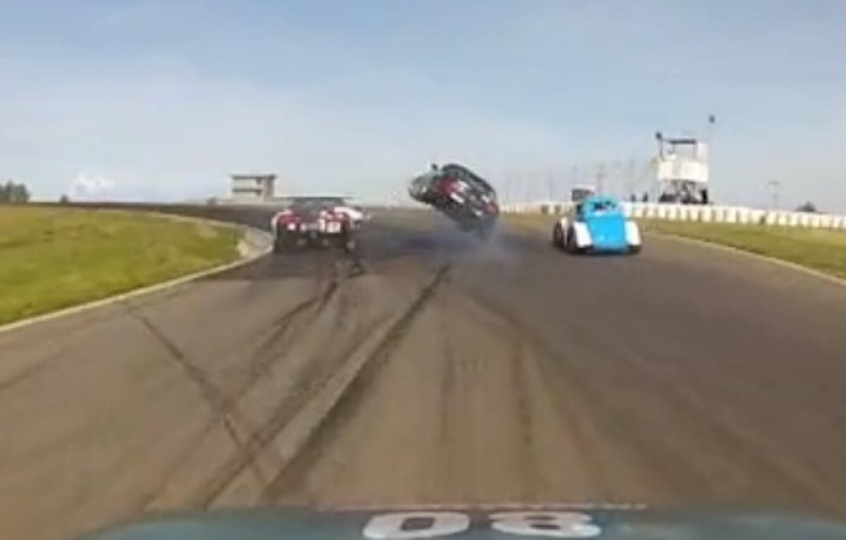 Unfortunately for the Miata, the Corvette driver spots the yellow flag displayed by a corner worker for an off-track car ahead, and applies some generous center pedal, practically parking at the apex of the turn. From there on out, things turn into a physics experiment – the Miata hits the blunt rear end of the Corvette on the right side and launches several feet in the air, parts flying everywhere, while the Legend car heads for the dirt to avoid the worst of it.