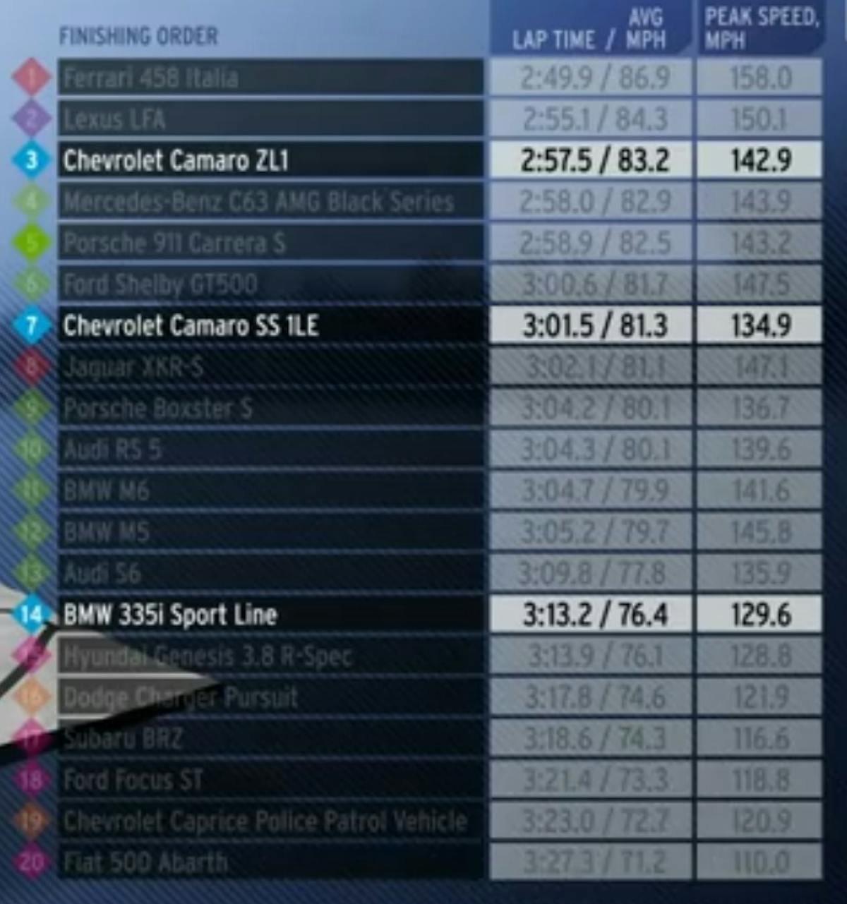 Of course, an added benefit is seeing how your favorite rides fared against the competition in other price categories. Both the ZL1 and 1LE Camaros were put in the LL2 class for cars priced $30K to $59K along with the new BMW 335i, while the evil Shelby GT500 was placed in LL3 for cars priced $60K to $120K.