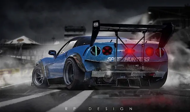Starting with a standard production ZR1 Corvette photo, and utilizing the magnetic lasso tool in Photoshop, the original background is quickly stripped away. Implementing aftermarket fender flares of a first-generation Skyline, the ‘Vette gets a unique look with a bit of stretching and trimming of the fender flares to fit the sleek Chevrolet body.