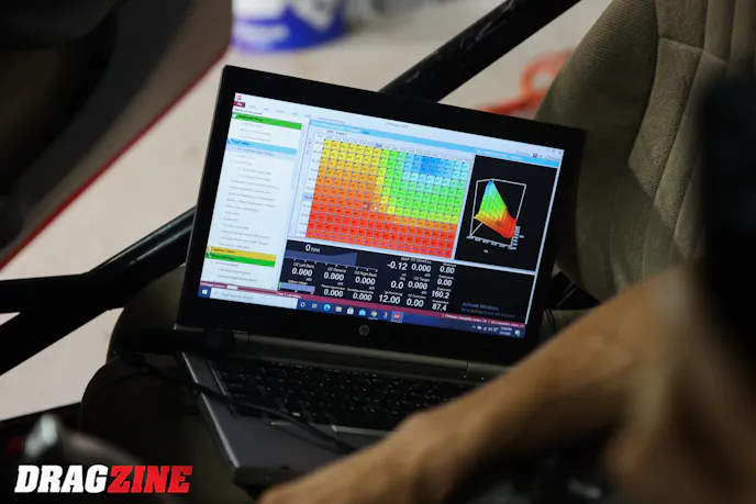 Before any tuning pulls were made, De Leon used the remote tuning functions of the FuelTech software to take a look at the base tune so he could see what he was working with. From there, De Leon made several adjustments to the fuel and timing maps to get them closer to what the engine would need so it would run better after being installed in the car. De Leon had Mundy make a couple of quick baseline pulls to see how the engine reacted under a load after his initial changes and then made some additional adjustments.