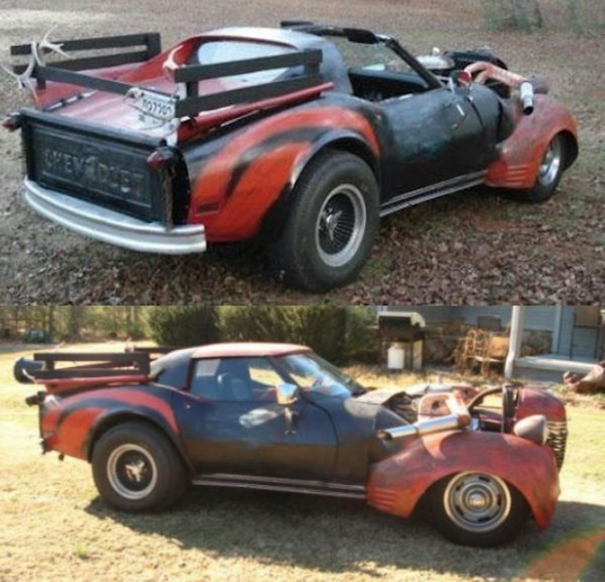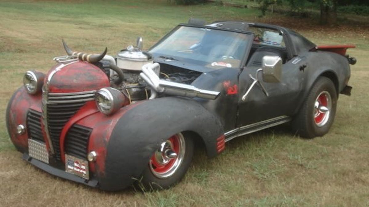 God only knows why one would ever do something like this to a perfectly good Corvette but here you go! Dig the fat fendered Chevy truck front clip, bed rails, long horns and motor home mirrors. Is there an old Chevy truck somewhere with the front clip of a Corvette grafted on? Oy!