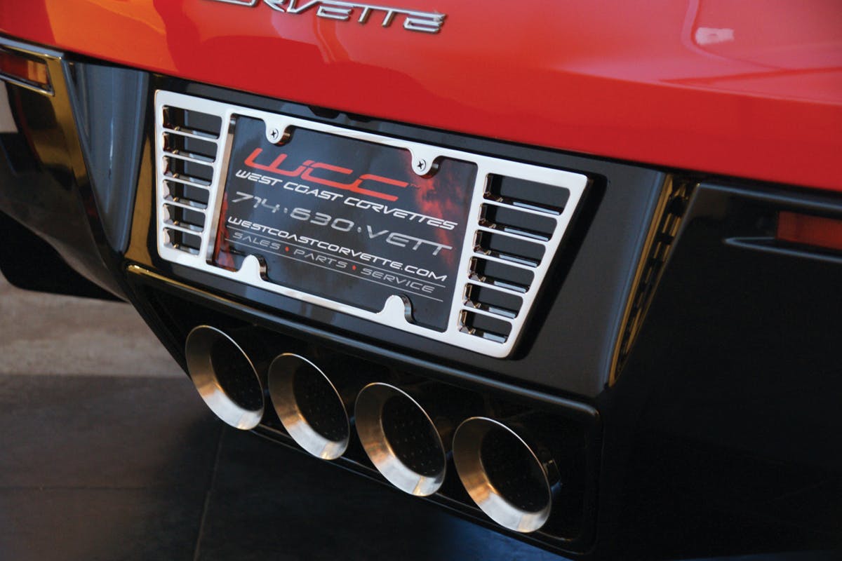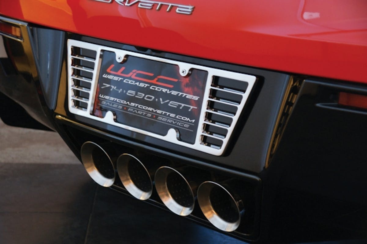 Few cars are more richly endowed with incredible performance and well-sculpted looks than the 2014 Corvette Stingray. West Coast Corvette has eye-catching add-ons for you and your C7, like this brand new billet rear license plate frame. Airplane-grade and giving off just the right amount of shine and sheen, this frame brings it all together out back with its angled louvers and triple chrome plating.