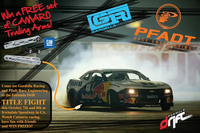 As Pfadt Race Engineering cheers on Gardella Racing’s Camaro driver, Ryan Tuerck, at the 2011 FormulaD Season Finale this coming weekend at the Irwindale Raceway, they will be looking for a deserving fifth-gen owner to take home a pair of their performance trailing arms. Tuerck, with his Pfadt-equipped Camaro, will be working to close the distance and overtake the current points leader in the series, Daijiro Yoshihara.