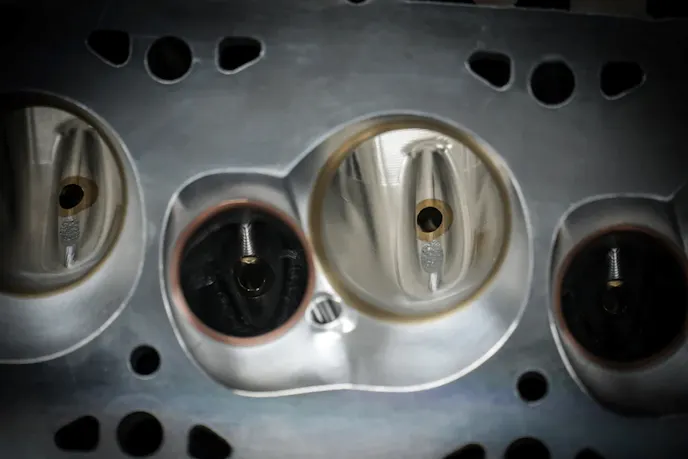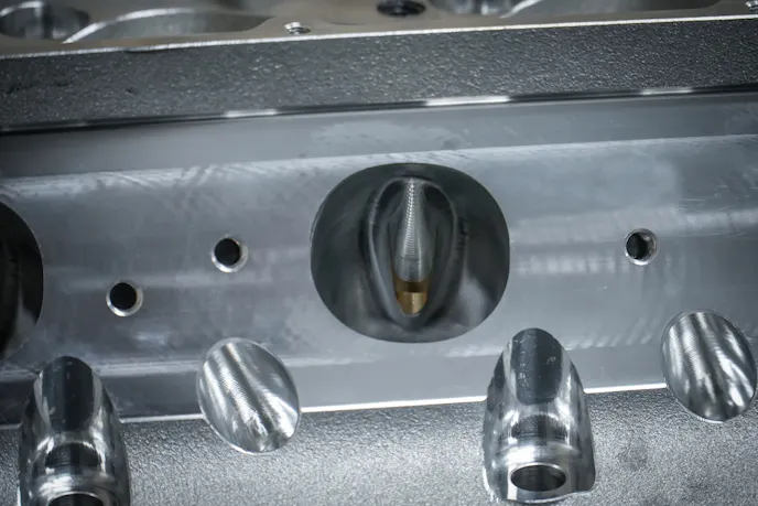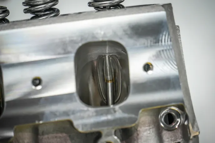 As part of the canted valve redesign that required repositioned valve guides and reshaped the ports, the valve spring pockets needed to be raised as well. This adjustment leaves more material around the seat area, improving strength under high spring pressures and allowing the pockets to be machined for larger-diameter valve springs without compromising durability.