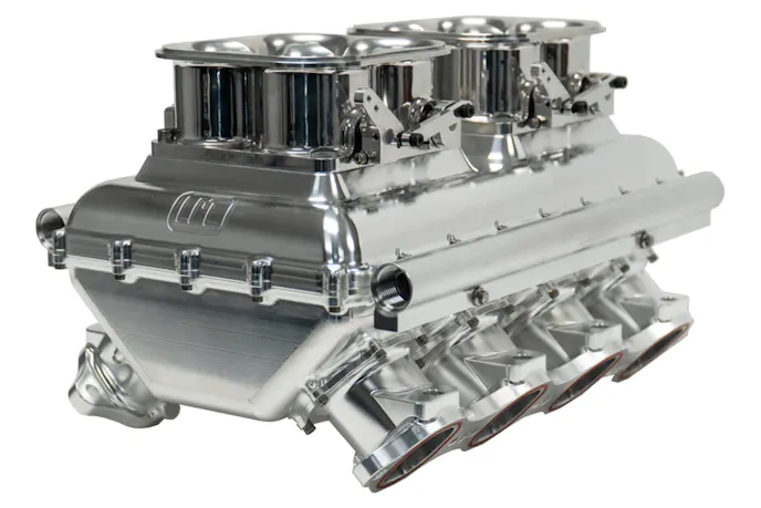 You can have a dual-square-bore-flanged intake manifold, a forward-facing intake for improved hood clearance with several throttle body options, or a single plane 4500-flange high-rise intake that LME used during development testing on a 468 cubic-inch LS with LME canted valve LS heads that made 1,018 at 8,400 rpm and 705 at 6,800 rpm naturally aspirated on an engine dyno.