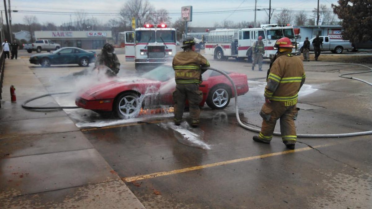 It’s every Corvette owner’s nightmare – you’re sitting in a restaurant, enjoying breakfast, when somebody comes running in the front door yelling, “Call 911! There’s a red Corvette on fire!’ That’s exactly what happened to Corvette Forum user Mark C., known as “pologreenenvy” on the board. The Fort Smith, Arkansas resident was enjoying a day out when an electrical fault set his 1988 Corvette ablaze.