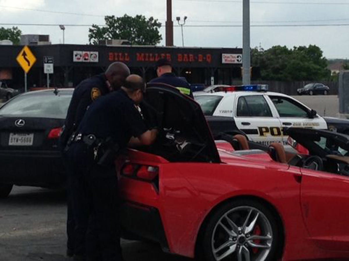 The twentysomething suspect took off on foot behind a nearby fast food restaurant and on into a creek. He made it up until about 20 minutes later when he was arrested and taken into custody by the police. A search of the scene found two firearms in the back of the Corvette, but it’s unclear if they belonged to the suspect or the C7’s actual owner.