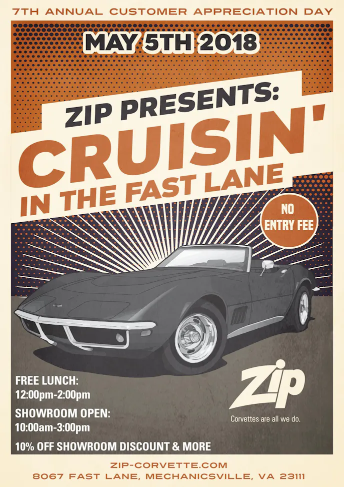 This year’s scheduled fun starts at 10am but we would suggest you get there early for the best parking spots! As a thank you to their many customers and a fitting introduction to any prospective ones, concessions and lunch are complementary. Lunch will be served from noon until 2. Attendees will also enjoy on-site, showroom discounts and specials. You’ll have opportunity to meet the Zip team and enjoy the day celebrating all things Corvette.
