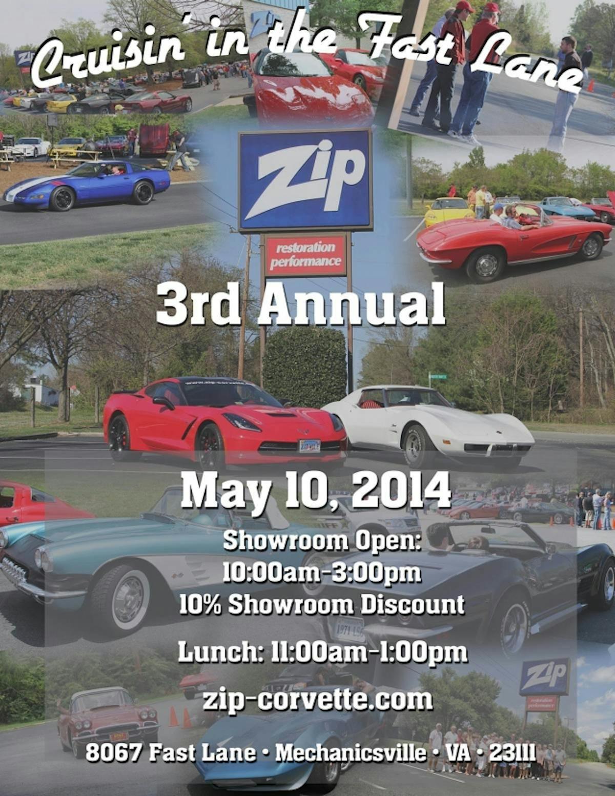 In the vicinity of Richmond, Virginia? Looking for something fun and Corvette-related to do on Saturday, May 10th? Then may we suggest you set aside a little time to go visit our friends at Zip Corvette and be a part of their third annual “Cruisin’ in the Fast Lane” customer appreciation day.