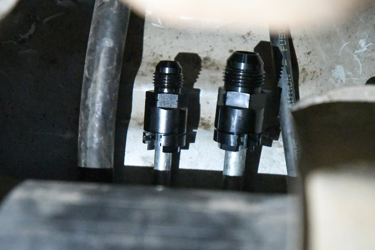 We began at the rear of the car, working forward to minimize mess and complication. The factory hard lines were quickly abandoned in favor of our new AN setup. A snapped factory line, impossible to repair, further justified the upgrade. With the old lines drained and removed, attention turned to mounting the vital components.