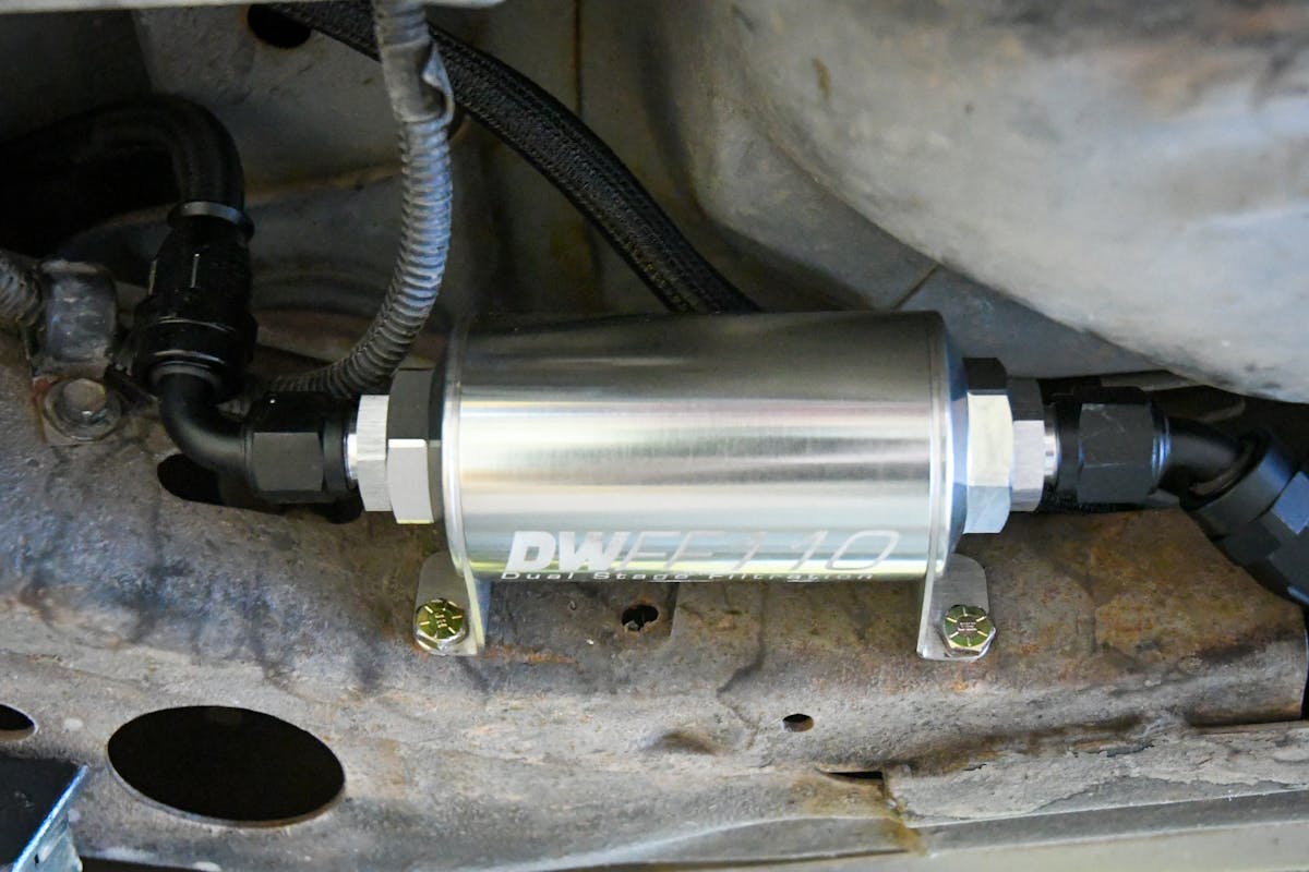 Armed with this knowledge, our focus shifted to the fuel lines, the fittings, the filter, and the regulator. DeatschWerks offers a vast array of AN fittings in various sizes and angles, ensuring a clean, custom installation. We opted for -8AN for the supply line and -6AN for the return. The real beauty of an AN-plumbed system lies in its versatility. With a selection of straight, 45-degree, 90-degree, 120-degree, and 180-degree fittings, routing the lines is a breeze. Add in the ability to cut the nylon-braided PTFE hoses to length, and the possibilities are endless. DeatschWerks’ fittings are manufactured to applicable JIC and SAE standards, constructed from heat-treated 6061 aluminum, and anodized in a titanium or matte black finish.