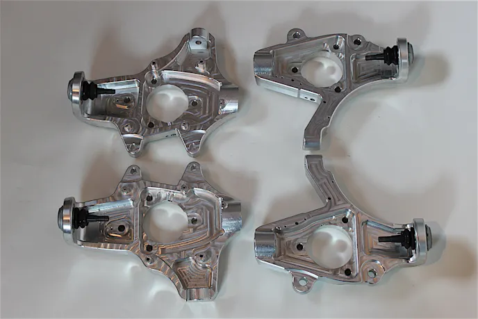 “Now you can drop the car and still have room for adjustment either with the factory leaf spring bolts or with our optional coil over kits for even further ride height changes from stock. Other benefits include a much stiffer wheel bearing mount for less deflection of the wheel and rotor assembly, and a stronger ear mount for the caliper for better pad wear.”