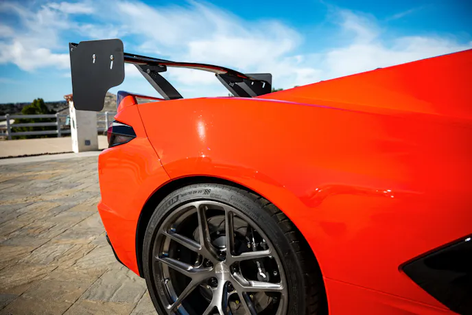 For the C8 Corvette, LG offers its carbon fiber GT2 Tunneled Splitter and GT2 Wing. According to LG, this aero package is aggressive and can greatly increase the downforce on the car to the point that a stiffer coil spring may be needed depending on the speed of the track. Additionally, LG recommends the front splitter and rear wing be used together to keep the car balanced and settled at speed.