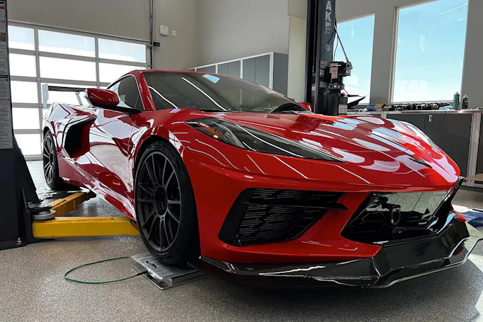 To complete phase two, we are installing new track-focused coilovers along with front and rear aero components. The goal of these modifications is to maximize the C8’s handling abilities by making the car more planted to the track’s surface at speed. The new coilover suspension will soak up any bumps and rough spots, and the aero package will greatly increase the downforce on the car, helping it stick to the road. “Big Willow is a tough track to master,” Ward says. “With the stock suspension, bumps in the course upset the car, particularly in the high-speed turns like turn eight.”