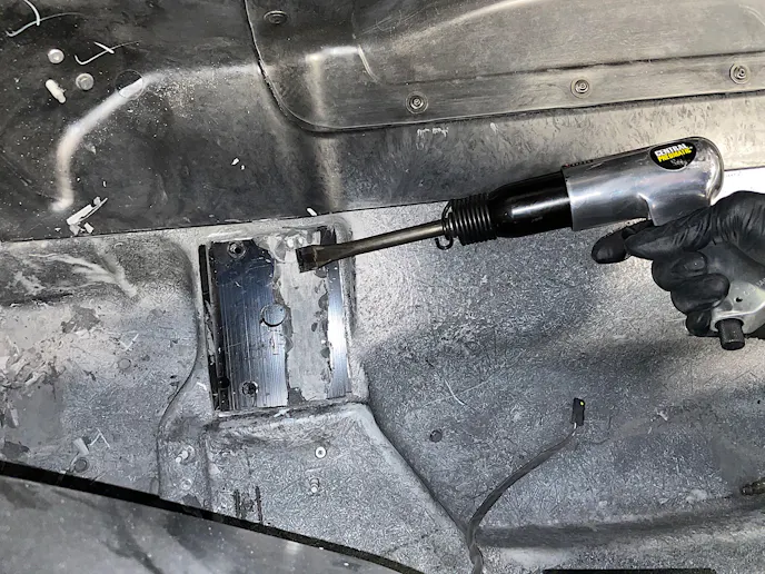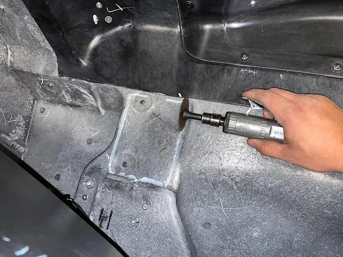 Our resident tech, Seth Ward, had no problems making surgeon-like cuts to Track Addict’s hatch to make room for the GT2 wing. Each pylon is mounted to the car’s frame using five bolts. With the interior panels and carpet removed, you mark and drill the mounting holes and mark the footprint of each pylon. Before the pylons can be bolted to the car, a layer of hard composite material must be removed so the pylons are mated directly to the metal chassis. A small cut-off wheel and a chisel are very helpful for this part of the installation.