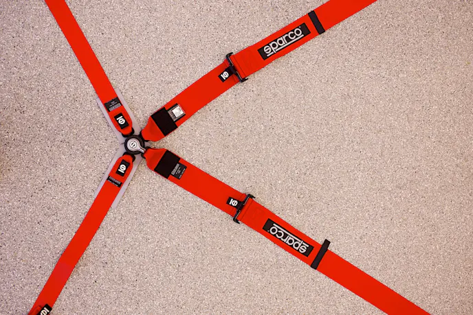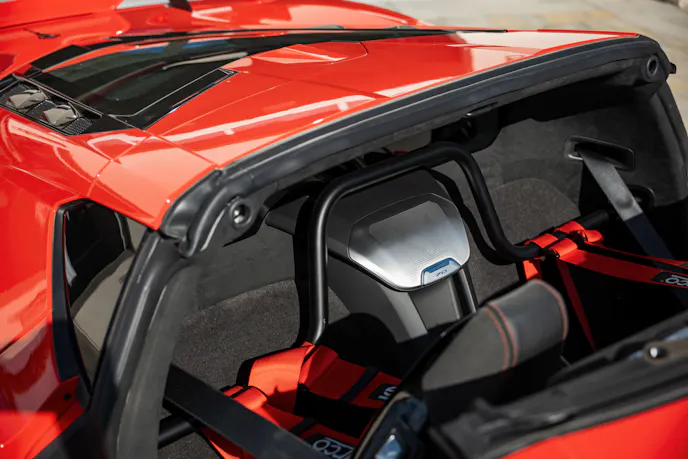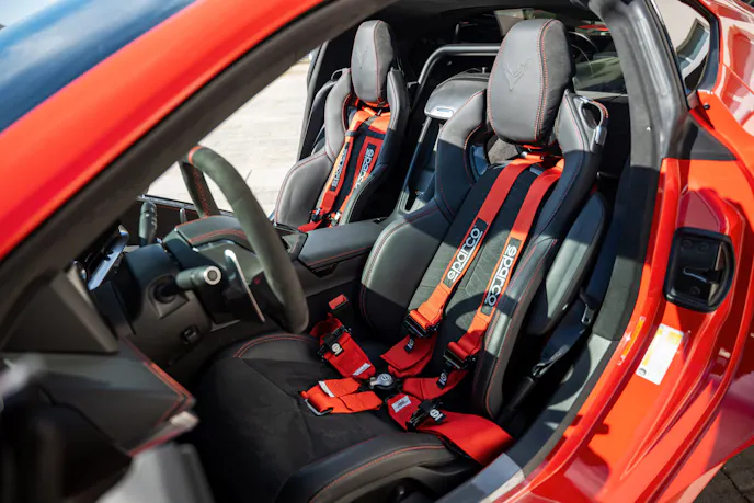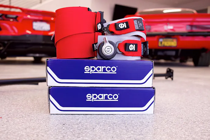 Installing the harness bar is a straightforward process that we completed in no time. Once the interior panels were removed, the holes could be marked and drilled for attaching the harness bar to the C8’s structure. With the harness bar installed, we were able to attach the Sparco four-point harnesses. The Sparco C8 harnesses feature three-inch shoulder belts and two-inch lap belts made of high-quality fabric with durable fasteners. These harnesses are also FIA-approved so we can pass through tech at the track with no worries. Each of the four belts attaches using snap-on fixings, and the built-in padded load spreader in the lap belts makes the Sparco harnesses easy to buckle. We chose to go with red harnesses to match our C8’s red exterior.