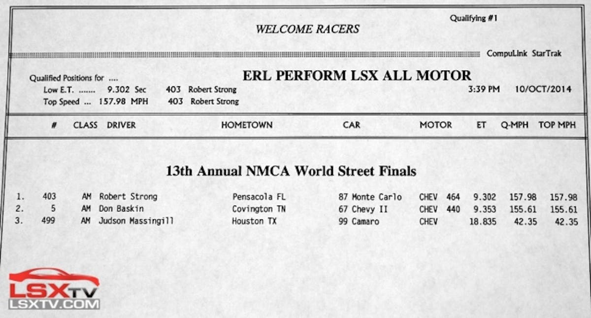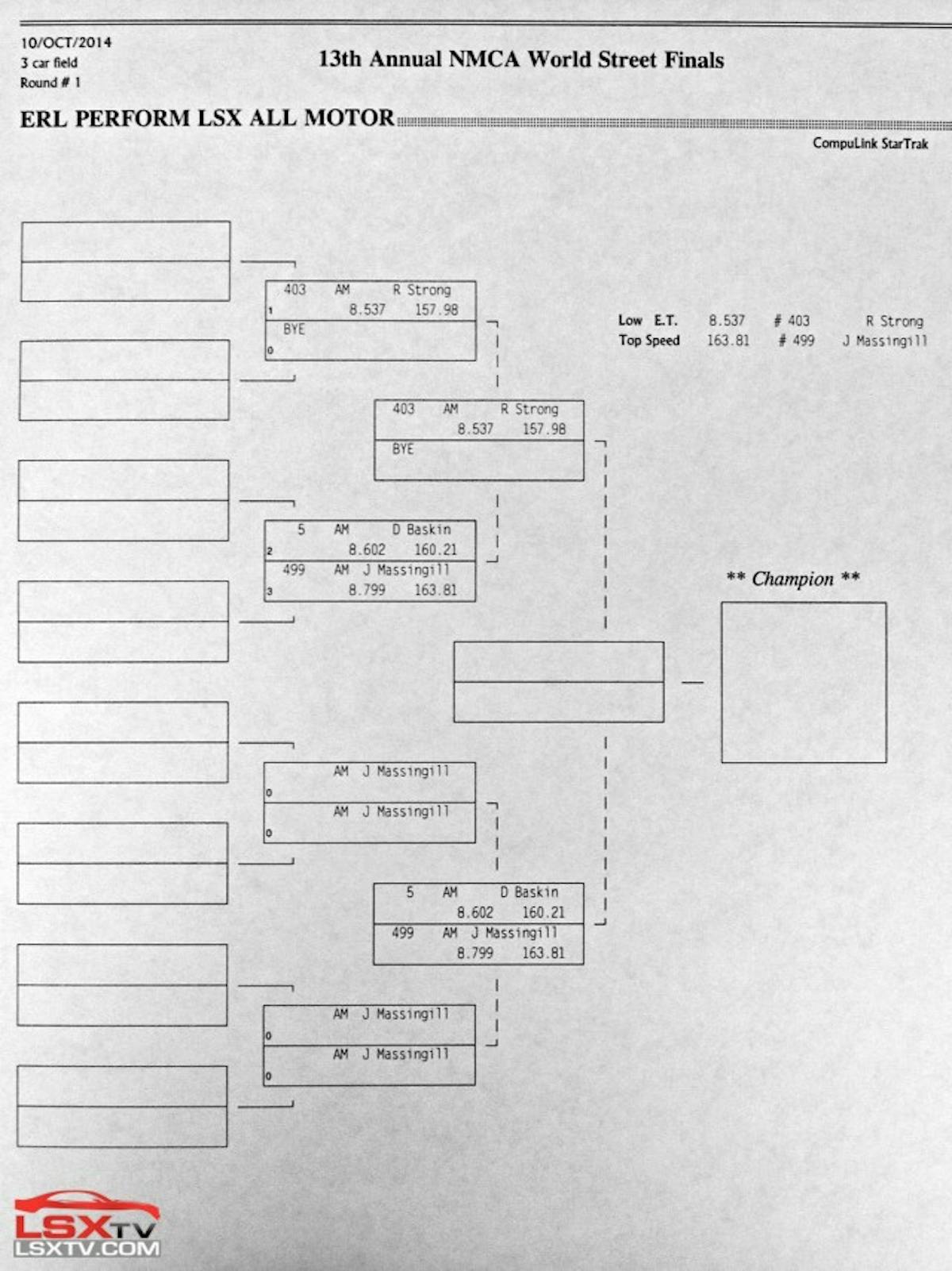No change in the batting order for the All Motor class as the result of the second qualifying round, but the elapsed times tumbled – all three competitors are in the eights, with three tenths covering the field. Strong will get a competition bye into the final, while Baskin and Massingill will pair up to determine who will meet him there.