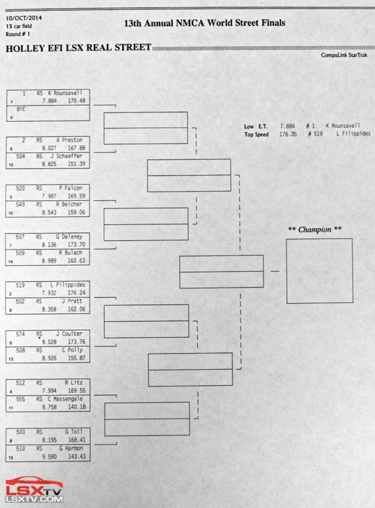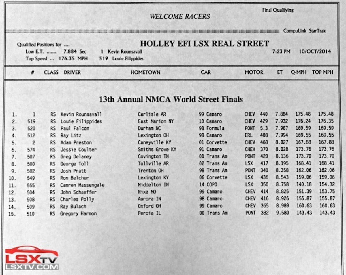 Kevin Rounsavall retained top position in Real Street with a marginally quicker second pass, but the big mover was Louis Filippides who went from DNQ to the number two slot with a home run 7.932 pass. That leaves the top two, plus Falcon and Ray Litz as the Seven Second Club, with everyone else stretching out through the low eights and beyond. It should make for some lively competition once eliminations begin.