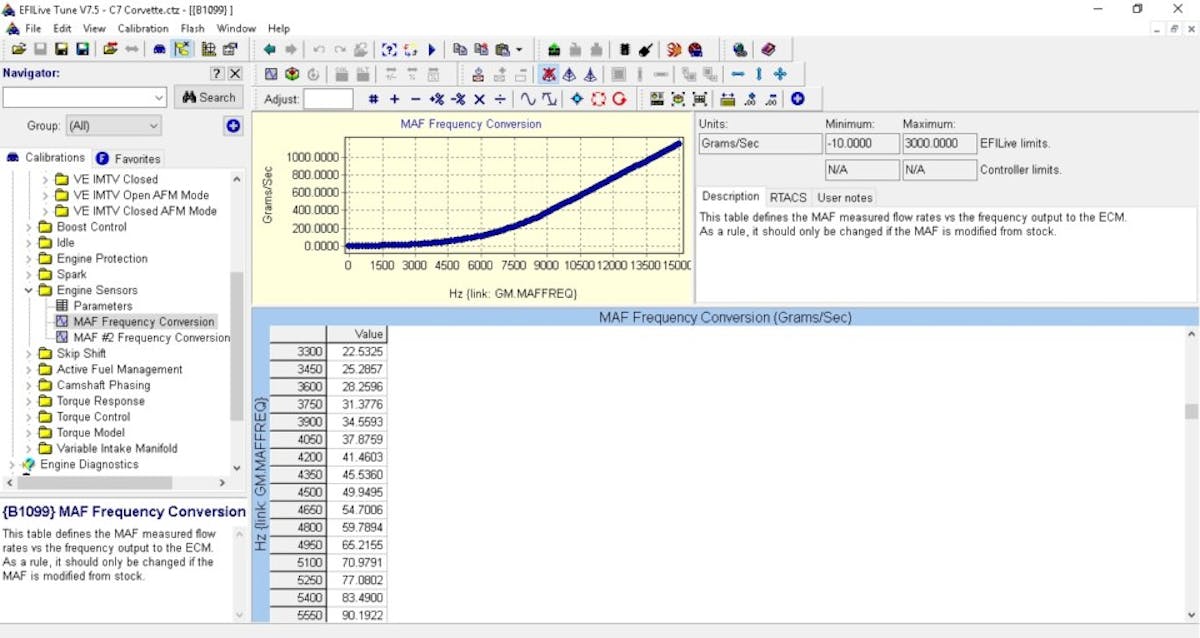 Focusing on the MAF transfer function, first we need to reestablish a new curve that provides the controller the correct airflow to Hertz. Here is the table for the MAF that needs to be addressed.