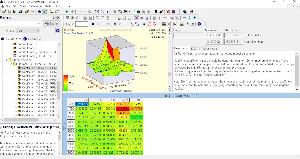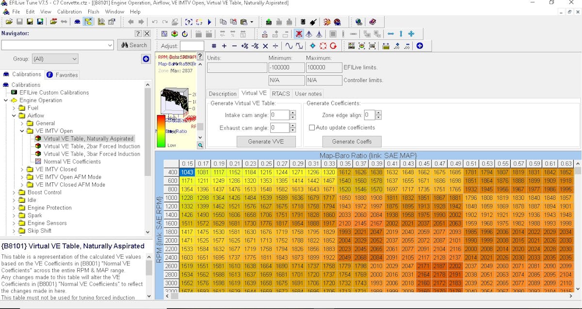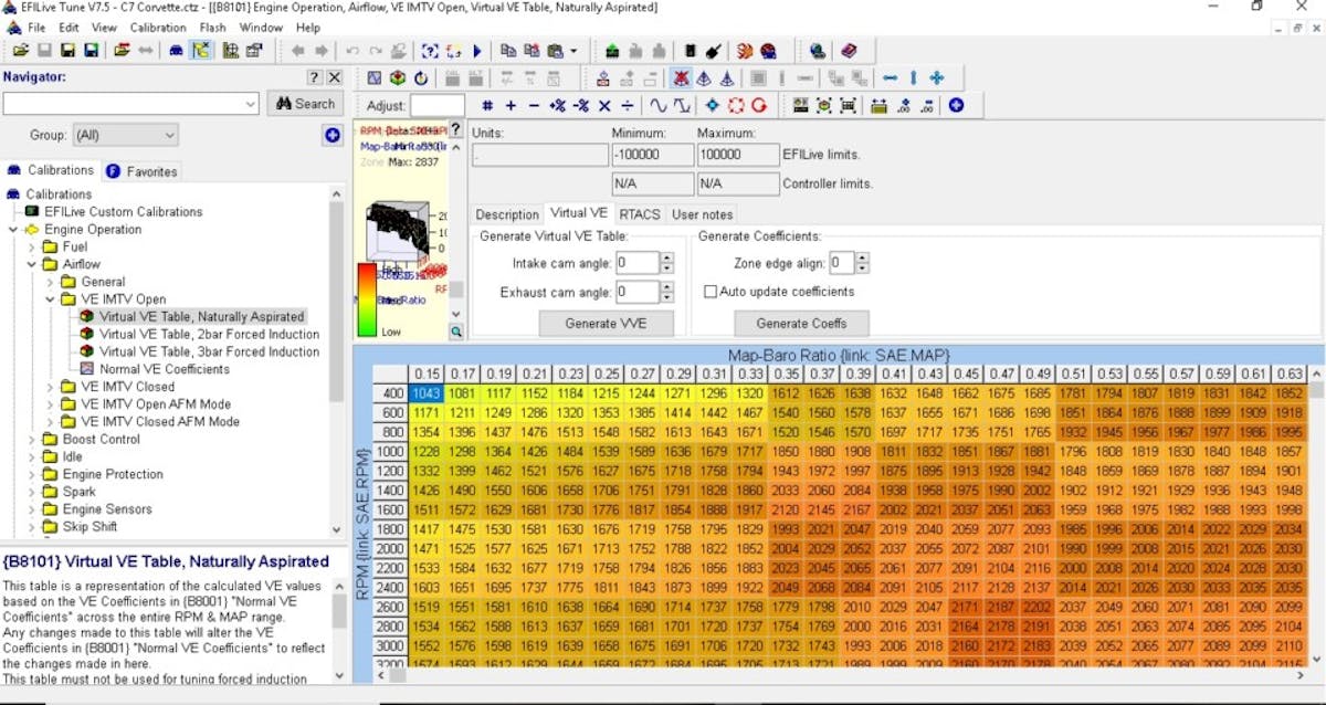 Now we need to address Speed Density, which is a bit more tedious. However, thanks to some neat tools within the EFI Live software this process has become much easier. Since the old style 2-dimensional volumetric efficiency surface table no longer exists, EFI Live has built a tool that allows the user to work off a “virtual” table that is represented like a 2D table but calculates the engineering coefficients that the modern controller uses for its fuel calculations. The following shows this table.