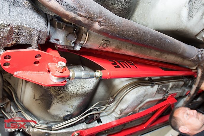 The bolt-in adjustable torque-arm (PN TA001) is a tubular design and is constructed using tubed steel and heavy-duty MIG-welded mounting plates. It’s designed to bolt-in directly into the factory location. However, we opted for BMR’s torque arm relocation crossmember (PN TCC006). This component clears the factory exhaust system, as well as all aftermarket exhausts. Since we opted for the adjustable version, the new unit is equipped with a rear-adjuster, which allows for pinion-angle adjustment. The kit also includes a low-deflection front mounted polyurethane bushing.