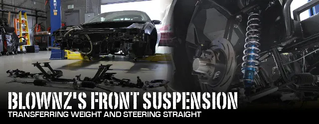 Nailing a launch at the drag strip all starts with getting the right amount of weight transferred from the front of the car to the back at the exact moment when the rear end needs all the help it can get to plant the tires. That weight transfer all begins in the front suspension set up. It’s a vital task that can make all the difference in how well BlownZ will perform at the strip. So, we went to the experts at Spohn, Afco, PA Racing, Strange, and Mickey Thompson, to help us put together a front suspension combo that can keep things nice and straight through our passes, and help us drop plenty of pounds off the front of the car in the process.