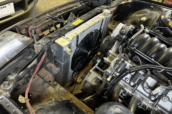 We lucked out with our project already being an LS-swapped car in a previous life, which meant the seller happily handed over plenty of parts to complete our swap, like mounts, exhaust, and the cooling system. The radiator in the car is an FSR dirt track radiator that a local radiator shop cut down to fit the compact sports car’s radiator support. To the naked eye, it’s rough around the edges, but it functions just fine. The noisy cooling fan, on the other hand, is from an unknown brand and was poorly mounted to the radiator.
