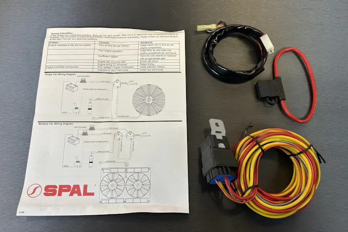 The fan wiring kit gave us everything we needed to give our electric cooling fan the current it needed to run at peak RPM without struggling. The straight-blade fan uses a lower amount of current compared to other designs, but an electric fan still draws high amperage and needs thick, high-quality wiring, relays, and fuses. The kit includes a weather-proof 40-amp relay and fuse holder, spare fuses, heat-shrink crimps, and enough thick-gauge copper wire to reach the back of the car, if needed.