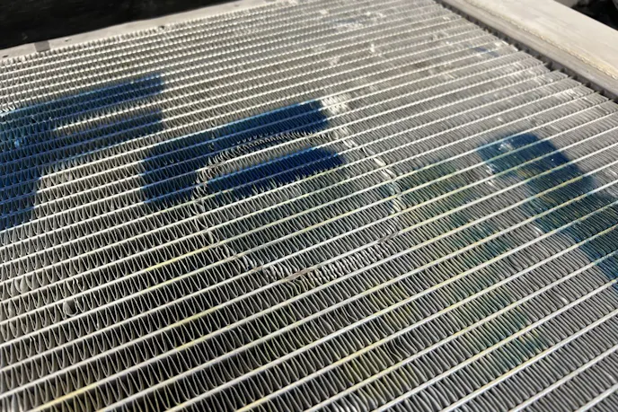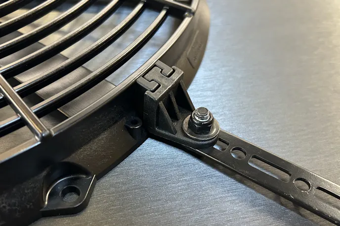 To complete our install, we also choose SPAL’s universal fan brackets and fan wiring kit to help complete our install. The fan brackets mount directly onto the fan housing and allow us to trim the metal legs as needed to attach to our custom-made radiator. The previous fan was attached via a universal plastic pull-tie mounting kit that clamps the fan through the radiator core. Over time, these can rub through the radiator and cause a leak; it looks like ours would’ve done the same if we had used it for much longer.