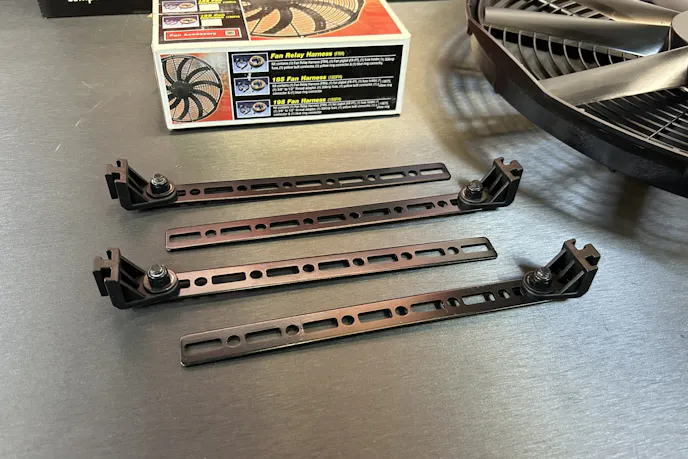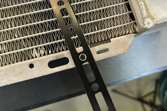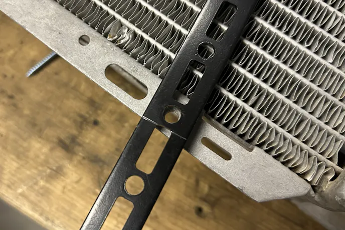As luck would have it, the holes in the SPAL universal mounting brackets line up perfectly with pre-drilled holes that came on the upper and lower rails on the radiator. So after double checking exactly where each bracket arm is going to bolt down, a quick scribe with a pocket knife to mark where we need to cut to remove the excess.