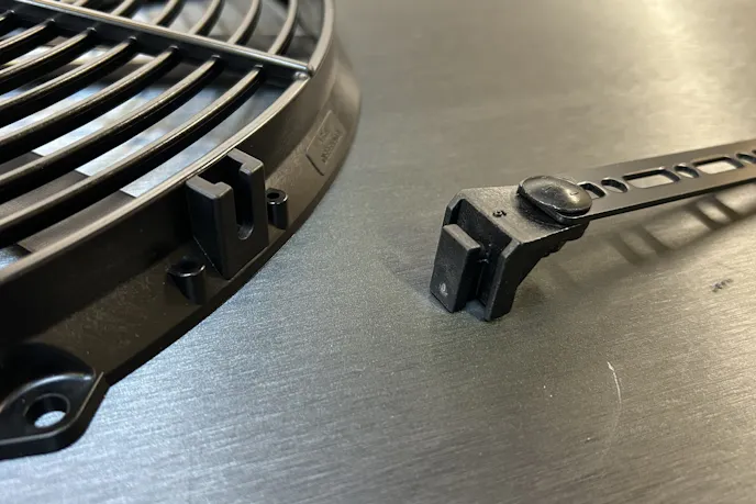 Since each metal arm needed to be cut in the same spot past the mounting hole, we carefully placed all four arms in a bench vice and used a cutoff wheel to cut all four in one big cut. After a quick cleanup with a wire wheel and some black paint, our SPAL electric cooling fan found its new permanent home attached to the RX7’s radiator.