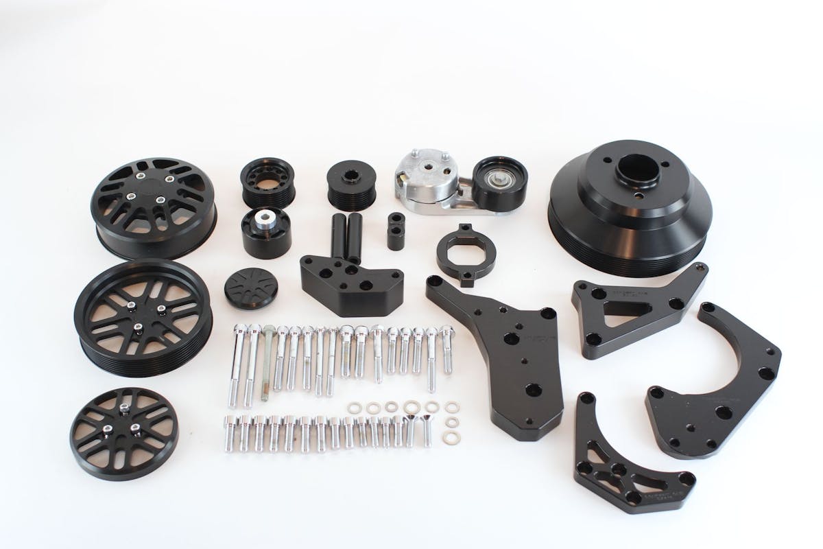 The pulleys and brackets in this accessory drive kit are also offered in a choice of four different finishes to ensure that the look of the package jives with the rest of your project’s aesthetic.
