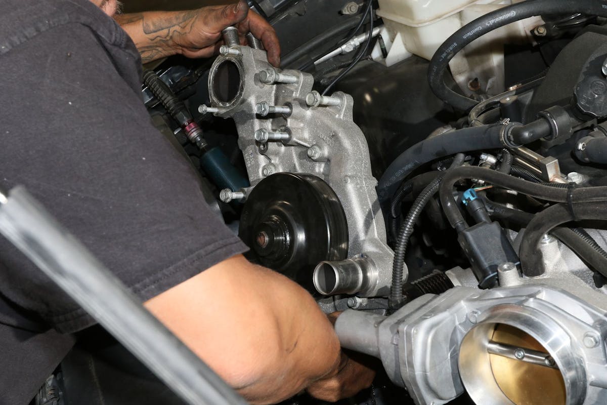 Installation of the new water pump is a straightforward process of removing the factory pump and installing the one sourced from Concept One. Once we knocked that out, we moved on to the unhooking and draining of power steering components and removing the old alternator.