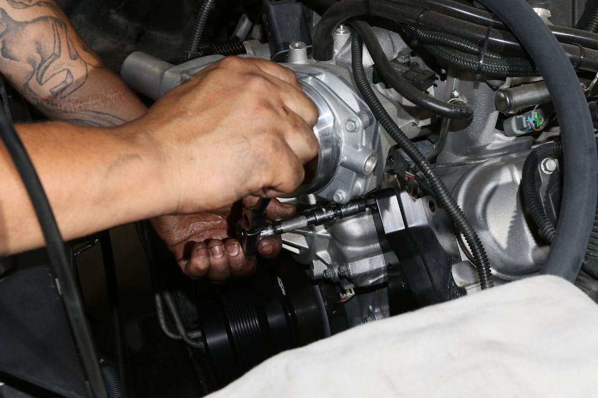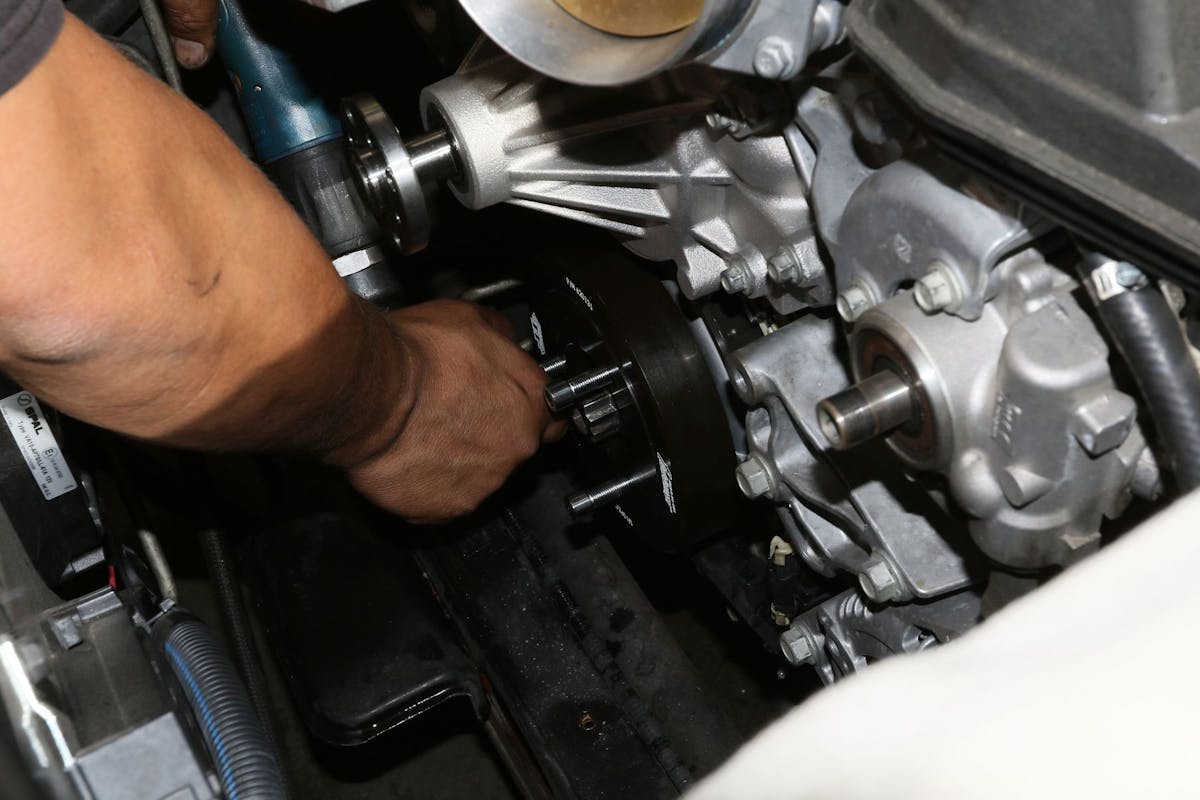 As one might expect, getting this installation underway involves the removal of some of the factory parts that are going to be swapped out for the components included in the Concept One kit. We started by draining the radiator, then removing the air intake and water pump, along with the idler pulleys and their associated bracket. After using an air chisel to loosen it up, we used a puller on the balancer.