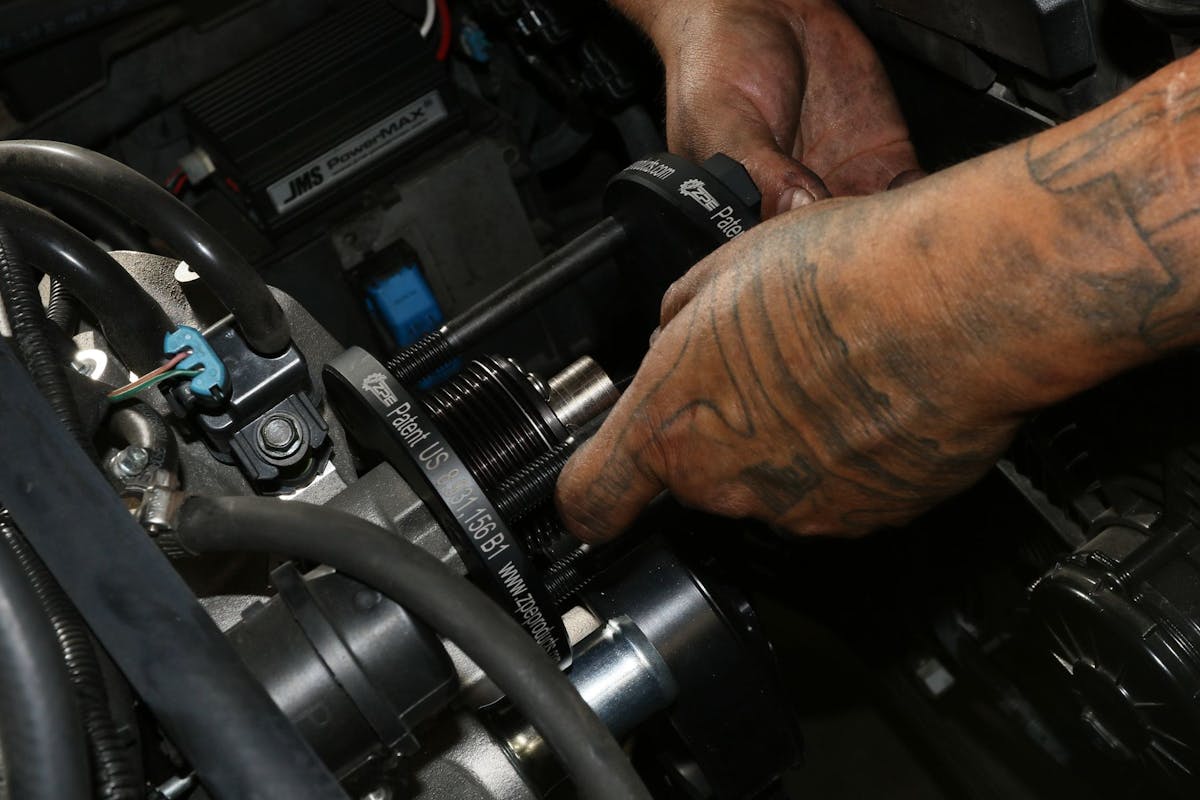 After unbolting the supercharger lid so we could remove the supercharger and its factory hub, we pressed on the Lingenfelter piece. Once secured, we reinstalled the supercharger and buttoned up the lid.