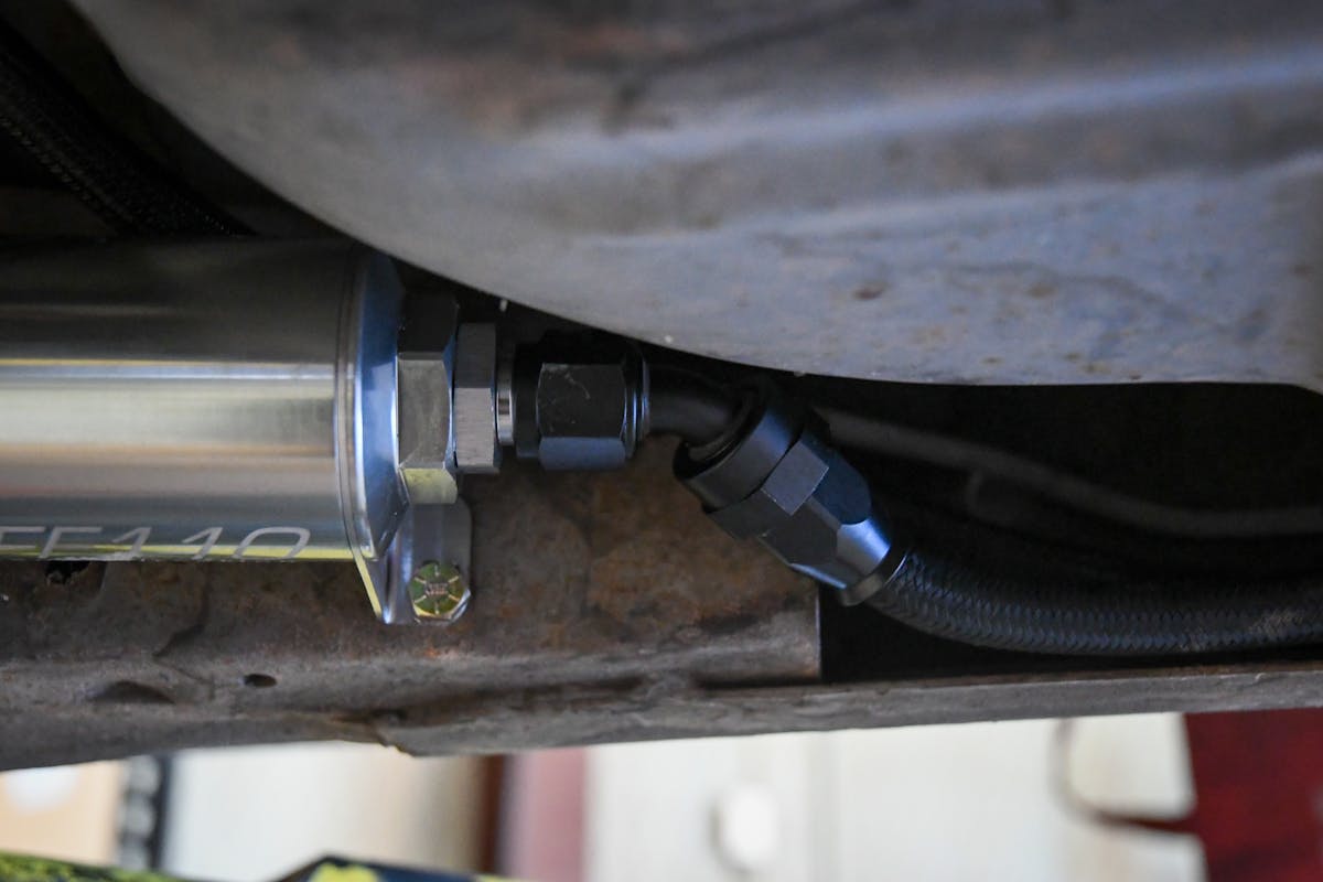With components in place, the hoses were cut to length and the AN fittings were carefully assembled. The supply and return lines were routed along the driver-side frame, keeping them a safe distance from the heat of the exhaust system. Insulating the lines further protects against heat soak.