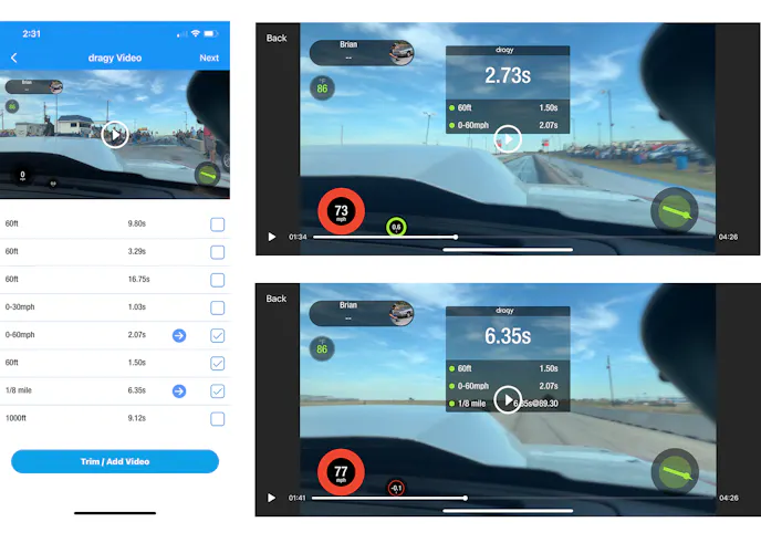 After making a couple of hits with the car, we went back to the pits to explore the app. It’s simple to use and offers a lot of features. You can set up a garage for your different cars, view history, and it even has a leaderboard that will let you know where your times stand all across the world. Our favorite feature is the video overlay that automatically adds data to the pass. This information can easily be trimmed right from your device so you can share it on social media or the leader board.