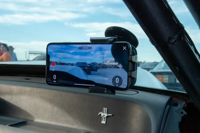 Since the magnet on the Dragy box seemed to be rather strong, we opted to throw the unit on the roof of Luke’s Mustang rather than on the interior. And while the placement doesn’t seem to matter for performance, we wanted to see if it would hang on during a launch. Plus, the blinking blue LED light on top of the box brought out the Fast and Furious in us –well, the first movie and not the atrocity of the most recent, anyway. We also used a cell phone mount which we bought at Five Below for only $5.00. The mount had a suction cup on the base, which we mounted on the passenger side of the windshield so it wouldn’t be in the driver’s line of sight.