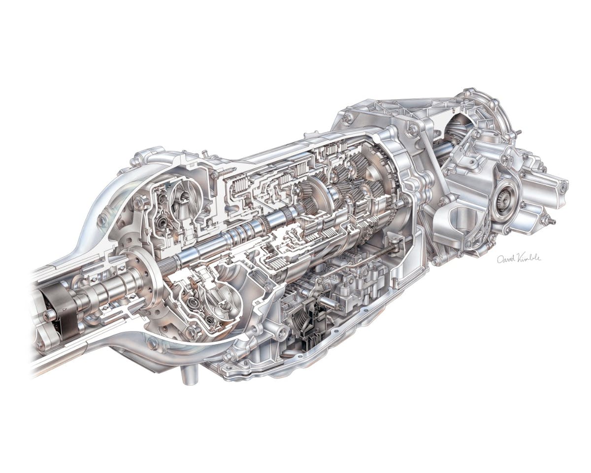One important change is an off-axis pump – rather than the typical pump layout that’s concentric to the input shaft, the 8L90’s pump is mounted in the valve body, and driven by a chain. The pump is also a “binary” design, meaning that during times of low pressure/volume demand, part of the pump can be shut down, resulting in 60 percent less torque required by the pump. The low mount also means that the pump primes better in cold weather, and the transmission has been extensively tested on a “tilt rig” transmission dyno to ensure that even during high-g cornering, the 8L90 maintains a full fluid supply.